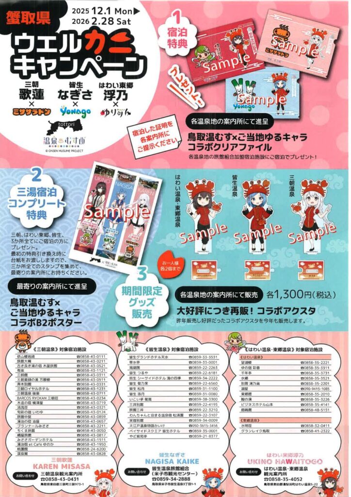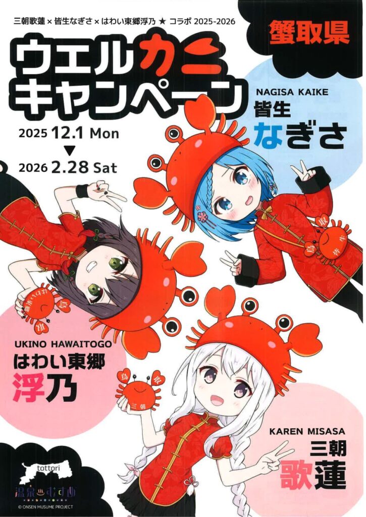 温泉娘ウエルカニキャンペーン イベント情報 2025.11.30ホテルスタッフSです。季節も秋から冬に切り替わってきましたね。姉妹館 海潮園でも蟹料理が始まりましてご好評いただいております。鳥取県で温泉娘とコラボしたウェルカニキャンペーンが12月1日から開催とされます。各温泉地の案内所でクリアファイルがゲット出来ちゃいます!!三湯宿泊コンプリートをしますと温泉娘の特典ポスターもゲットできます。当ホテルベイサイドスクエア皆生ホテルも皆生温泉の対象になっておりますのでこの機会に是非お泊り頂ければと思います。