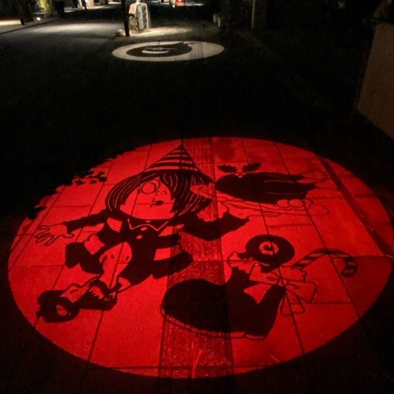 日没から深夜まで周辺の道路にクリスマスシーズンを楽しむ妖怪たちの姿が赤と緑のクリスマスカラーで22時までは現れたり消えたりして映し出されています。煌びやかさはないもののなかなかの風情と一味変わったクリスマスの演出はここでしか味わえません!