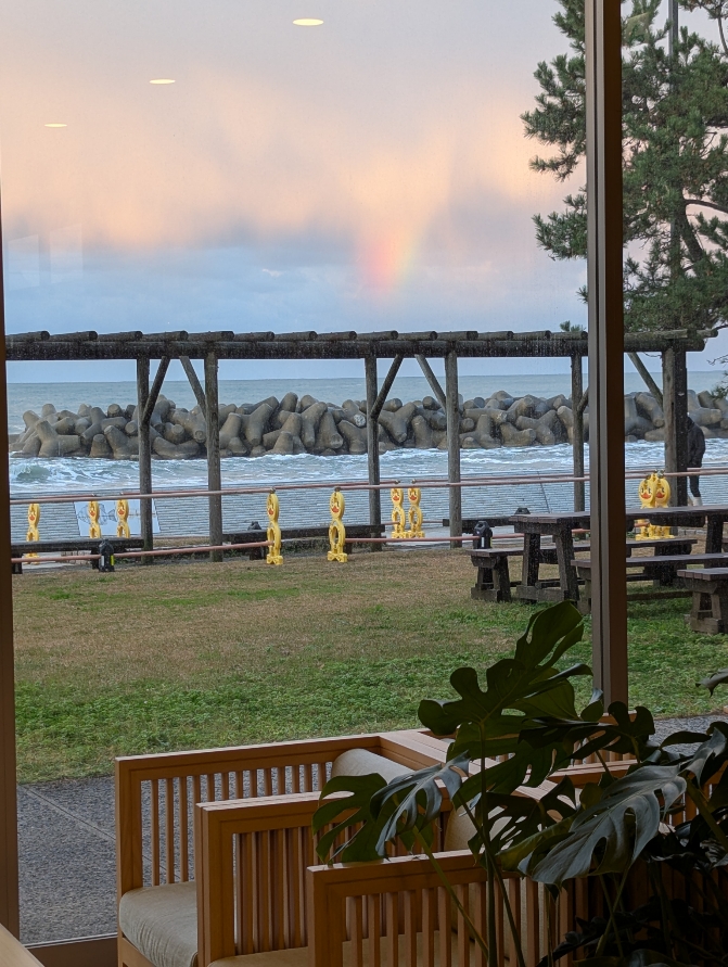 本日のオーシャンビュー! 未分類 2026.01.1830分間の虹でした!冬の厳しい天候の中の夕暮れ時、ほんのひと時幻想的な虹が日本海に現れました!出会えた方はラッキー!刻々と変化するオーシャンビュー客室をぜひご堪能下さい。