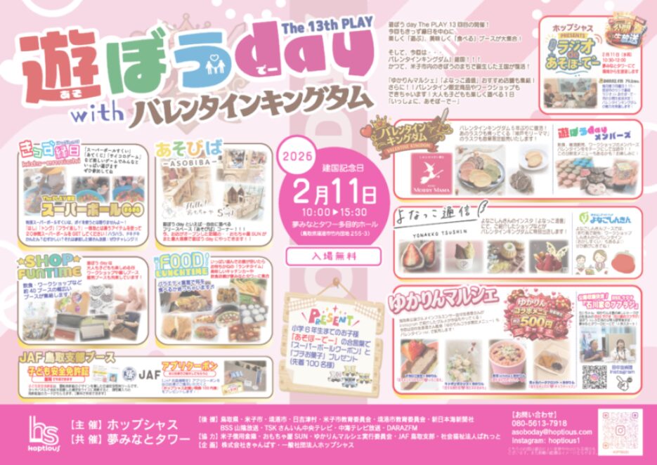 今回もきっず縁日を中心に、楽しく「遊ぶ」美味しく「食べる」ブースが大集合!「ゆかりんマルシェ」「よなっこ通信」おすすめ店舗も集結!さらに、バレンタイン限定商品やワークショップもできちゃいます!大人も子どもも楽しく遊べる1日「いっしょに、あそぼーでー」「ゆかりんマルシェ」「よなっこ通信」おすすめ店舗も集結!さらに、バレンタイン限定商品やワークショップもできちゃいます!大人も子どもも楽しく遊べる1日「いっしょに、あそぼーでー」みなさんもいかがですか?