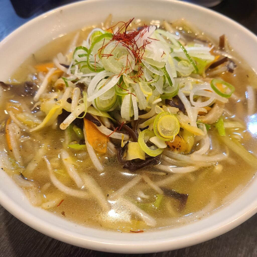 牛骨ラーメンと言えばシンプルな具材と透き通った甘みのある塩味が定番ですが、今回ご紹介するのは当ホテルから車で約4分(山陰労災病院前)にある牛骨ラーメン 麵屋 暁AKATSUKIさんの野菜たっぷりな塩野菜ラーメンです。牛骨スープにこれでもかというくらいたっぷり野菜が入り女性に人気の一品!